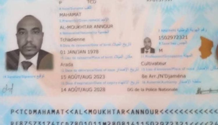 لمحمد المختار النور ببيانات كتب عليها تشادي الجنسية، مكان الميلاد: عراضة، تاريخ الميلاد: 1/1/1978م، ورقم الجواز / RF8757317-المهنة: مزارع اصدار انجمينا بتاريخ 15/8/2023م .