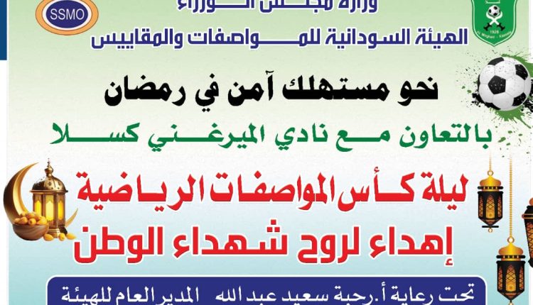 وفي هذا الإطار، تنظم الهيئة ليلة كأس المواصفات الرياضية بالتعاون مع نادي الميرغني، ممثل ولاية كسلا في الدوري الممتاز، وذلك تكريمًا لروح شهداء الوطن.